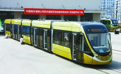2014年4月9日,國(guó)內(nèi)首個(gè)具有國(guó)際領(lǐng)先技術(shù)的100%低地板現(xiàn)代有軌電車(chē)在南京浦鎮(zhèn)車(chē)輛有限公司下線(xiàn)。(本報(bào)資料照片) 記者 馮芃攝