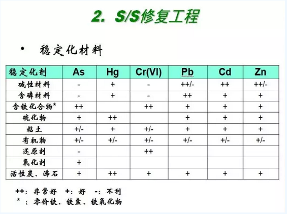 土壤重金屬穩(wěn)定化處理的材料包括:堿性材料、含磷材料、含鐵化合物、硫化物、粘土等。不同的材料其適用的土壤重金屬的不同。由于土壤性質(zhì)和場(chǎng)地環(huán)境條件不同,相同的穩(wěn)定化處理材料對(duì)同樣的重金屬,其處理效果也會(huì)出現(xiàn)有利或不利的影響(見(jiàn)表1)。對(duì)于土壤重金屬的固化處理,主要的修復(fù)材料主要包括:水泥、專(zhuān)利材料、粉煤灰、石灰、瀝青等,其中水泥和專(zhuān)利材料使用比例最高。