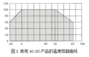 目前,大多數(shù)常規(guī)電解電容的額定工作溫度為105℃,但因電解電容在高溫條件下電解液易揮發(fā),電源本身發(fā)熱較大等原因,常規(guī)采用電解電容的AC-DC電源只能工作在70℃的環(huán)境條件下。要提高電源的工作環(huán)境溫度,必須采用價(jià)格更昂貴、體積更大的電解電容,或者以降額的方式實(shí)現(xiàn)高低溫條件下的應(yīng)用,下面以金升陽(yáng)常規(guī)AC-DC電源產(chǎn)品在高低溫環(huán)境下的降額要求如圖3: