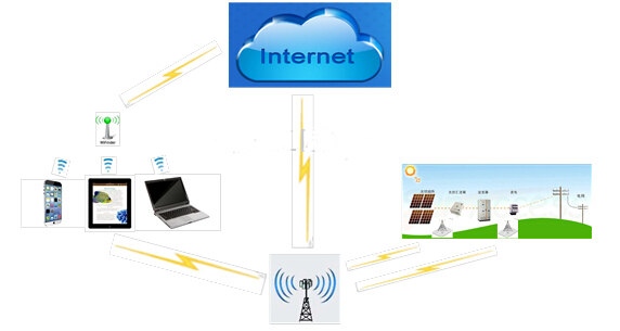 智能光伏電站在中控室附近設置中央通訊基站,在光伏區(qū)和設備區(qū)設置若干個子基站以加強信號接收和傳遞,光伏電站的監(jiān)控信號和控制信號通過無線通訊技術進行傳輸,中控室接受到信號后通過互聯(lián)網(wǎng)將實時數(shù)據(jù)自動上傳到云儲存,運維人員可在任何有無線網(wǎng)絡的地方通過手機客戶端或使用基于互聯(lián)網(wǎng)Web的軟件調用云儲存信息對電站進行監(jiān)視和控制。示意圖如圖3: