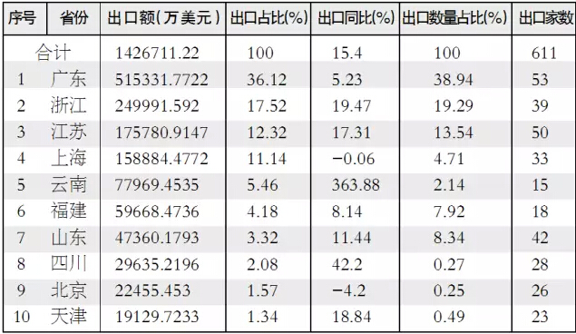 2014年我國低壓電器出口主要省市統(tǒng)計(jì)
