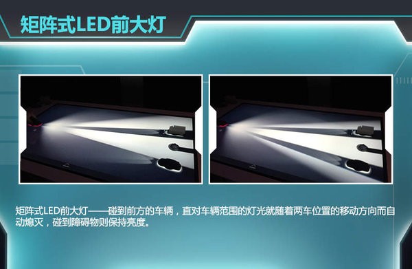 有車輛、物體識別功能及區(qū)別對待功能的矩陣式LED前大燈——碰到前方的車輛,直對車輛范圍的燈光就隨著兩車位置的移動方向而自動熄滅,碰到障礙物則保持亮度。