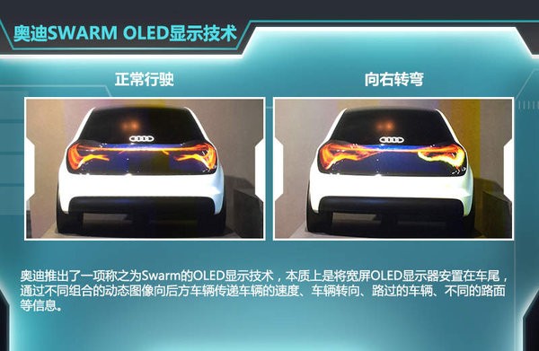 這是動感流光變幻尾燈,可發(fā)出色彩斑斕、圖形變化多端的燈光,只要法律允許,就可以應用。奧迪汽車通信技術(shù)部經(jīng)理阿努潘.珀姆.馬霍拉特介紹:“這項概念技術(shù)叫做the“swarm”,它通過動態(tài)照明技術(shù)來顯示車尾照明系統(tǒng),以及車輛轉(zhuǎn)彎時的情景。”原理是將寬屏OLED顯示器安置在車尾,通過動態(tài)的圖像傳遞信息。除了汽車剎車外,車輛的速度、轉(zhuǎn)向信息、路過的車輛、不同的路面等信息都可以通過車尾顯示器上以各種不同組合模式和色彩呈現(xiàn)出來。
