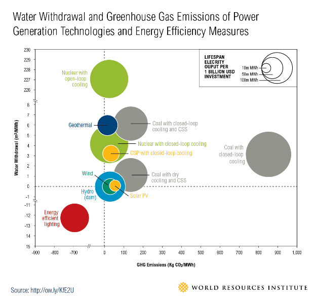 世界資源研究所開(kāi)展了“水-氣候影響分析”,比較了發(fā)電技術(shù)對(duì)水資源、溫室氣體排放和資金成本的影響。下圖分析了各項(xiàng)技術(shù)下每兆瓦時(shí)發(fā)電量的淡水取水量和溫室氣體排放,突出每項(xiàng)技術(shù)全生命周期生產(chǎn)或節(jié)約的電量,并根據(jù)資金成本進(jìn)行排序(按照2010年中國(guó)的技術(shù)成本計(jì)算)。例如,核電需要大量冷卻用水,而溫室氣體排放則可忽略不計(jì)。生命周期中每10億美元投資可產(chǎn)生160TWh左右的發(fā)電量。