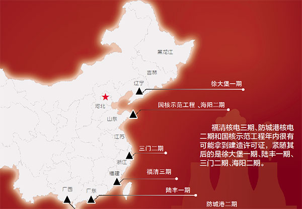 2014年以來(lái),中央政府頻頻釋放重啟核電建設(shè)的信號(hào)。去年4月,國(guó)務(wù)院總理李克強(qiáng)在主持召開(kāi)新一屆國(guó)家能源委員會(huì)首次會(huì)議時(shí)提出,“適時(shí)在東部沿海地區(qū)啟動(dòng)新的核電重點(diǎn)項(xiàng)目建設(shè)”;6月,國(guó)家主席習(xí)近平在中央財(cái)經(jīng)領(lǐng)導(dǎo)小組第六次會(huì)議上也表示,在采取國(guó)際最高安全標(biāo)準(zhǔn)、確保安全的前提下,抓緊啟動(dòng)?xùn)|部沿海地區(qū)新的核電項(xiàng)目建設(shè);12月國(guó)家發(fā)改委官員表示,中國(guó)將沿海核電工程列入國(guó)家重點(diǎn)推進(jìn)的重大工程建設(shè)包。