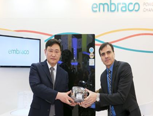 恩布拉科全球銷售與市場(chǎng)副總裁,北京恩布拉科雪花壓縮機(jī)有限公司總經(jīng)理路易斯.道(右)與晶弘電器有限公司常務(wù)副總經(jīng)理李琦(左)聯(lián)合展示最高能效、最安靜的恩布拉科VESF全驅(qū)變頻壓縮機(jī)