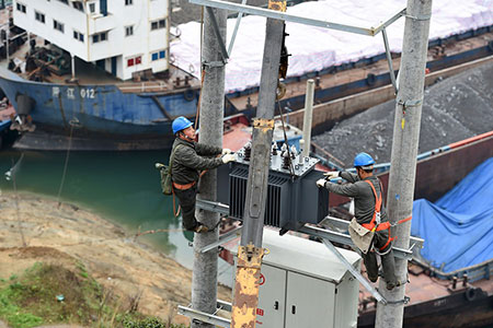3月18日,國網(wǎng)秭歸電力公司的員工在湖北秭歸縣茅坪鎮(zhèn)沙灣錨地吊裝315千伏安變壓器。新安裝的變壓器將為??吭阱^地的船舶進行供電,不僅讓待閘船舶減少了燃油發(fā)電的費用,而且減少噪音、污染,用上清潔能源。