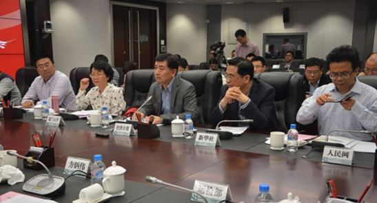 國網(wǎng)福建省電力有限公司黨組書記呂華忠(左一)向新華社、經(jīng)濟(jì)日報(bào)、人民網(wǎng)、中新社及中國經(jīng)濟(jì)網(wǎng)等媒體的領(lǐng)導(dǎo)介紹福建省清潔能源的使用情況。