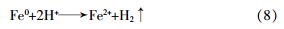 溶液pH是影響零價鐵降解有機染料反應(yīng)速率的一個重要參數(shù)。研究表明,零價鐵降解有機染料的反應(yīng)速率與溶液pH高度相關(guān)〔29, 30〕。當(dāng)溶液pH降低時,印染廢水的降解速率能夠獲得明顯提升。原因如下:〔1〕H+與零價鐵、有機染料三者間能夠迅速形成氧化還原反應(yīng)〔見方程式〔1〕、〔2〕〕,隨著溶液pH的下降,溶液中的H+濃度會顯著增加,進(jìn)而正向加強氧化還原反應(yīng),加快有機染料降解速率;〔2〕在高pH條件下,溶液酸堿度會對鐵離子氫氧化物這類沉淀物的生成起到促進(jìn)作用,而這類氫氧化物可能會在零價鐵表面形成表面隔離層,從而影響零價鐵進(jìn)一步的氧化還原過程。