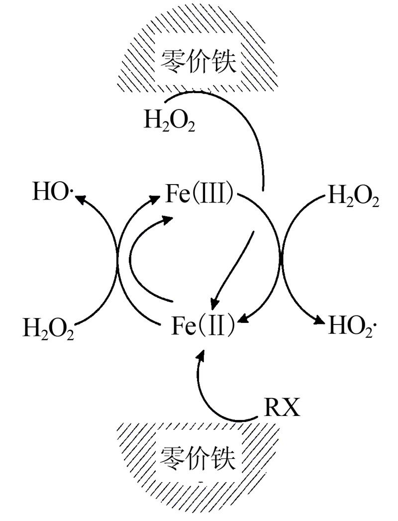 反應(yīng)方程式〔8〕中生成的Fe2+會通過反應(yīng)方程式〔6〕迅速與H2O2反應(yīng),生成Fe3+。這些Fe3+在零價鐵表面發(fā)生快速的氧化還原反應(yīng),再次生成Fe2+〔見反應(yīng)方程式〔9〕〕〔34, 35〕。這個系列反應(yīng)被稱為高級 Fenton反應(yīng),如圖 1所示。
