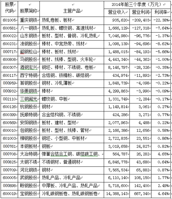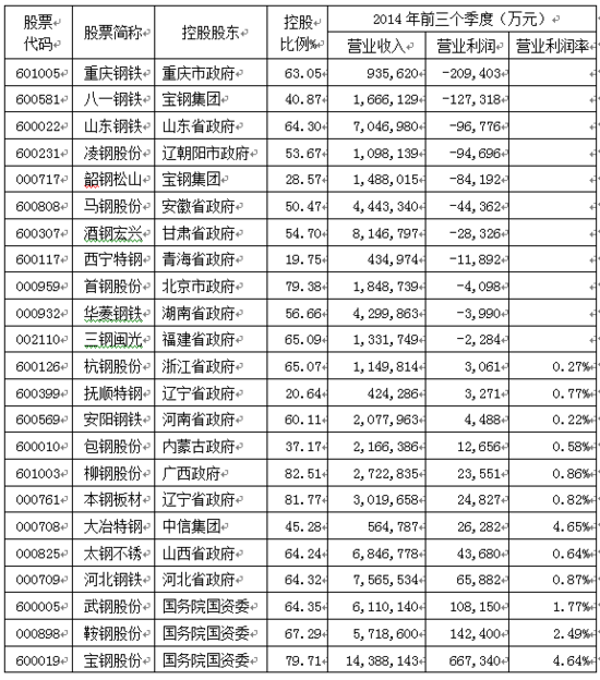 我國(guó)鋼鐵行業(yè)上市公司整體經(jīng)營(yíng)狀況不佳。23家由各級(jí)地方政府國(guó)資委控股的鋼鐵行業(yè)上市公司中,截至2014年前三個(gè)季度,有11家虧損;在12家盈利上市公司中,有8家上市公司的營(yíng)業(yè)利潤(rùn)率不足1%。(見下表)