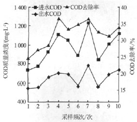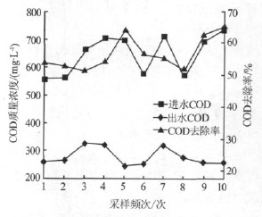 圖3 生物接觸氧化對(duì)COD的去除效果