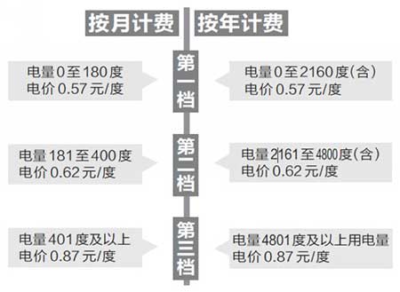 居民階梯電價(jià)執(zhí)行周期由月改為年后,各檔位居民全年用電總量、收費(fèi)標(biāo)準(zhǔn)均不變,僅計(jì)費(fèi)周期由零(每個(gè)月)化整(全年)進(jìn)行“打包”核算,即:全年第一檔電量為0-2160度(含),電價(jià)為0.57元/度;第二檔電量2161至4800度(含),電價(jià)為0.62元/度;第三檔電量為4801度及以上用電量,電價(jià)為0.87元/度。用電量按自然年度確定分檔,不跨年使用。居民用戶仍按月抄表并結(jié)算電費(fèi),當(dāng)累計(jì)用電量達(dá)到年度階梯電量分檔基數(shù)臨界點(diǎn)后,即開(kāi)始實(shí)行階梯加價(jià)。具體到今年,4-12月抄見(jiàn)電量按照第一檔1620千瓦時(shí)、第二檔1621至3600千瓦時(shí)、第三檔3601千瓦時(shí)及以上的階梯基數(shù)執(zhí)行。