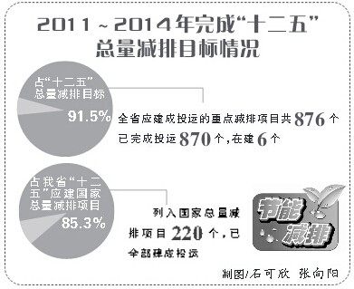 根據通報,2011年至2014年,全省應建成投運的重點減排項目共876個,占“十二五”總量減排目標責任書項目的91.5%,已完成投運870個,在建 6個。其中,列入國家總量減排項目共220個,占我省“十二五”應建國家總量減排項目總數的85.3%,已全部建成投運。