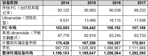 計算類終端設(shè)備市場今年預(yù)期將減少1.9%,主要受平板需求疲軟所影響。由于頂級ultramobile類終端設(shè)備將彌補傳統(tǒng)臺式機和筆記本電腦銷量的下滑,整體PC市場仍將持續(xù)小幅的增長。