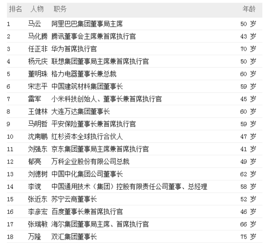 阿里巴巴的上市讓馬云成為過去一年里最受關注的商業(yè)領袖之一,他也是2015"中國最具影響力的50位商界領袖"排行榜的榜首,騰訊董事會主席兼首席執(zhí)行官馬化騰緊隨其后,華為董事長任正非今年位居第三,而王健林僅排名第八。