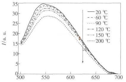 溫度在影響熒光粉的活性的同時(shí),也對(duì)熒光粉所激發(fā)的光波波長(zhǎng)產(chǎn)生一定的影響,下圖是溫度對(duì)熒光粉的發(fā)光波長(zhǎng)的影響。