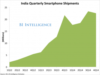 據(jù)市場(chǎng)研究機(jī)構(gòu)IDC的數(shù)據(jù)顯示,印度智能手機(jī)在2014年底的出貨量是兩年前的四倍多。