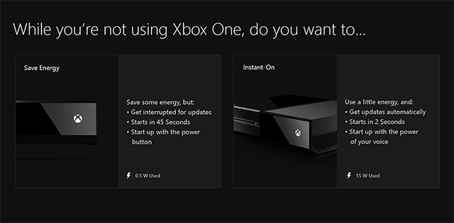 微軟最近公布的一個(gè)Xbox One使用政策中,在其首次開機(jī)使用時(shí),會(huì)允許用戶選擇是節(jié)能待機(jī)還是快速啟動(dòng)待機(jī)兩種待機(jī)模式,以應(yīng)對(duì)近期環(huán)保組織美國(guó)自然資源保護(hù)協(xié)會(huì)對(duì)于Xbox One能耗的質(zhì)疑。