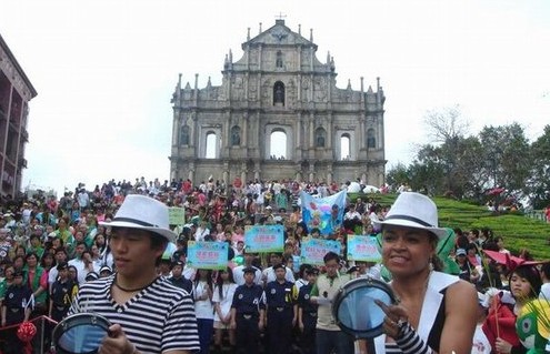 澳門清潔環(huán)保大巡游聯(lián)隊伍在大三巴牌坊前準備出發(fā)