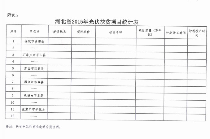 1.關于扶貧電站項目的申報。請有關市發(fā)改委會同曲陽、平山、巨鹿、臨城、平泉、赤城6個光伏扶貧試點縣(平泉作為省直管縣單獨申報),按照《全省光伏扶貧工程實施方案》確定的各縣2萬千瓦扶貧電站、5萬千瓦配套商業(yè)電站規(guī)模,落實具體建設項目名稱、投資業(yè)主、場址等,按附表1填報。