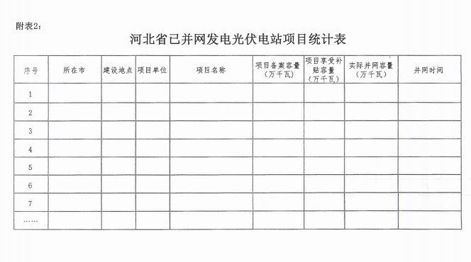 2.關于已并網發(fā)電項目的申報。請省電力公司、冀北電力公司盡快核實已并網光伏電站項目實際并網容量,按附表2準確填報項目名稱、項目容量、并網時間、現已并網容量等。