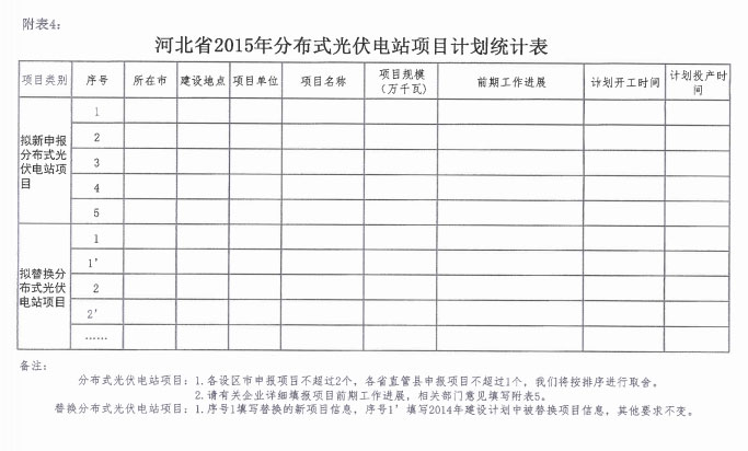 4.關于分布式光伏電站項目。請各市發(fā)改委、省直管縣發(fā)改局對列入去年計劃的分布式光伏電站進行認真梳理核實,對不符合接入35千伏以下電壓等級條件的項目,應從原計劃中剔除,可由新項目補充;對進度慢、今年6月底前仍不能并網投產的項目,也可由同等規(guī)模的新項目替代;對建設條件已基本落實,有關部門已出具初步認可意見(有附表5)的項目,按要求數目推薦。以上擬替代、補充和申報的項目請按附表4填報,超過推薦數額要求的按排序取舍。