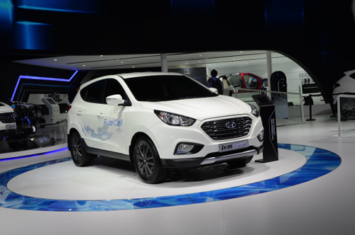 我們就拿車展上這臺早已量產(chǎn)的現(xiàn)代ix35FuelCell為例,來看看采用燃料電池技術(shù)的純電動車有哪些顯著區(qū)別。從外觀上來看,使用燃料電池系統(tǒng)的車型并無明顯差異,不過相對一般電動車來說,燃料電池電動車型會與使用內(nèi)燃機(jī)車型一樣設(shè)計(jì)有前進(jìn)氣格柵,因?yàn)槿剂想姵氐姆磻?yīng)同樣需要“進(jìn)氣”來與液氫作用產(chǎn)生電力。