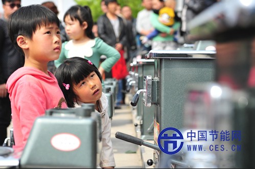 兩個(gè)小女孩在饒有興致地觀看展出的新能源采暖爐 李文梅 攝