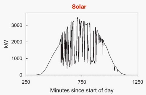 新能源:大部分綠色能源如風能、潮汐能、太陽能等等都有劇烈變化的特點。不僅一天之內各個時間段差別巨大,而且前一分鐘和后一分鐘也差別巨大。由于這種變化太過頻繁(如下圖),用一般的充電電池做儲能設備幾天就報廢了,而超級電容則可以通過暫時存儲幾分鐘的能量,讓整個曲線變得非常平滑。