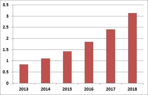 特別要指出的是,電池技術進步的速度遠遠比超級電容要慢,一個3000F的超級電容,從2000年的5000美元已經(jīng)降低到現(xiàn)在的50美元,降低了100倍;而同樣時間內的相同容量的電池價格只降低5~6倍。所以隨著技術的進步,超級電容將會有越來越多的應用。下圖是IDTech給出的市場預測,單位是十億美元。