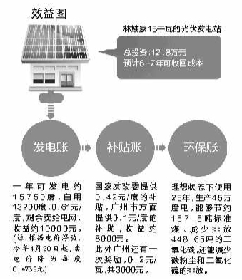 藍(lán)色硅板在陽(yáng)光下泛出光澤,在航拍小飛機(jī)的視野里,白云區(qū)麓景路一棟居民樓的樓頂尤其顯眼。這是林姨家新裝的家庭光伏發(fā)電站,可以將太陽(yáng)能轉(zhuǎn)化為電能,今后林姨不僅可以靠它發(fā)電自用,還能把用不完的電賣(mài)給供電局賺錢(qián)。這已經(jīng)是廣州第18家家庭式光伏發(fā)電站。從去年7月第一家誕生至今,老廣對(duì)這一新鮮事物表現(xiàn)出極大的興趣。第一家安裝屋頂發(fā)電站的黃雨霖說(shuō),經(jīng)濟(jì)效益不算可觀。不過(guò)學(xué)者表示,把環(huán)保賬一并算入,光伏發(fā)電站如能大規(guī)模應(yīng)用,對(duì)減排的貢獻(xiàn)將比較可觀。