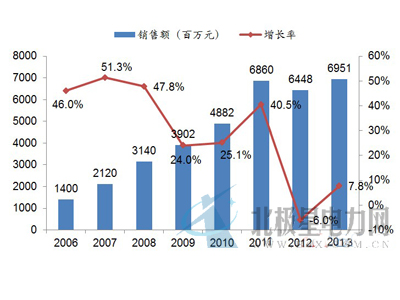 圖表 1:2013年高壓變頻器市場(chǎng)規(guī)模與增長(zhǎng)率