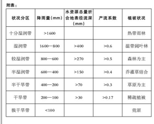 考慮到上述標(biāo)準(zhǔn)只是生活與生產(chǎn)的需水標(biāo)準(zhǔn),如沙漠綠洲地曠人稀,人均水資源量可能很大,但水生態(tài)系統(tǒng)惡劣而脆弱,同樣難以保障可持續(xù)發(fā)展,我們同時(shí)確立了“生態(tài)水”的概念,建立了地表徑流深的水生態(tài)標(biāo)準(zhǔn)(見附表)。