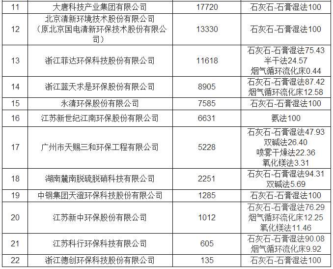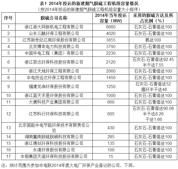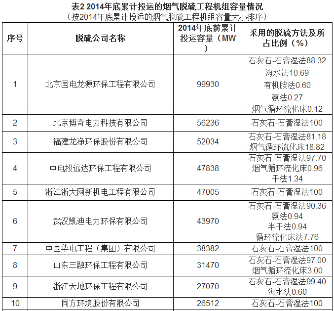 參加2014年度火電廠環(huán)保產業(yè)登記的環(huán)保公司中,2014年投運的新建煙氣脫硫工程機組容量情況見表1,截至2014年底累計投運的煙氣脫硫工程機組容量情況見表2。