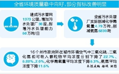 通過各項減排措施的實施,全省環(huán)境質量總體穩(wěn)中向好,局部地區(qū)和部分指標改善明顯。16個州市政府所在城市環(huán)境空氣中二氧化硫、二氧化氮和可吸入顆粒物平均濃度較2013年分別下降了22.7%、5.88%、2.0%。地表水水質進一步好轉,全省179個國控、省控河流斷面中,水質達到Ⅲ類以上的斷面有131個,占斷面總數73.2%,比2013年提高4.7個百分點。化學需氧量平均濃度下降5.3%,氨氮平均濃度下降11.5%。
