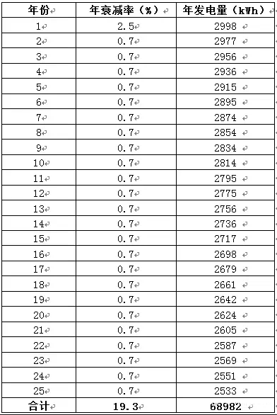 按照安徽省的光照資源和日照時(shí)數(shù),年利用小時(shí)數(shù)按1025小時(shí)計(jì)算(參照《2014中國太陽能發(fā)電建設(shè)統(tǒng)計(jì)評價(jià)報(bào)告》),電池組件衰減率參照國家能源局《關(guān)于征求發(fā)揮市場作用促進(jìn)光伏技術(shù)進(jìn)步和產(chǎn)業(yè)升級意見的函》(國能綜新能〔2015〕51號)中最高衰減率上限(第一年衰減率2.5%,25年內(nèi)衰減率20%),25年內(nèi)發(fā)電量估算如下: