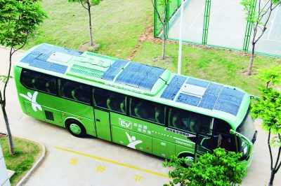 太陽能電動(dòng)大巴車頂上鋪滿了太陽能光伏電板。