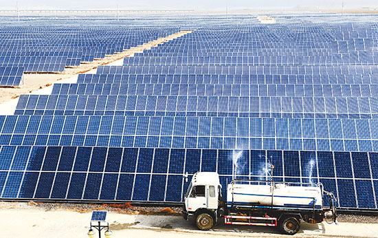 華電嘉峪關新能源有限公司員工正在沖洗光伏太陽能發(fā)電板