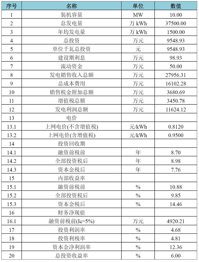 測算條件:單位千瓦造價(jià)為9400元,裝機(jī)容量為10MW,年滿發(fā)小時(shí)數(shù)為1500h,電價(jià)為0.95元/kWh