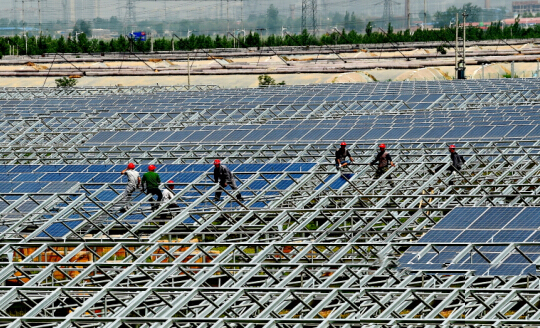 5月8日,在石家莊循環(huán)化工園區(qū)200兆瓦光伏農(nóng)業(yè)科技大棚并網(wǎng)發(fā)電項目施工現(xiàn)場,工人們正在棚上安裝太陽能光伏板。這是目前河北省單體面積最大、也是石家莊首個農(nóng)業(yè)光伏科技大棚項目,一期工程已接近尾聲,6月底可竣工并網(wǎng)發(fā)電。一期工程總面積約2300畝,年均發(fā)電量約為5473萬度,可節(jié)約標(biāo)準(zhǔn)煤7萬多噸。該項目實現(xiàn)了棚上太陽能發(fā)電的同時棚下還將種植茶樹、高端花卉苗木、食用菌等高附加值產(chǎn)品,通過引入物聯(lián)網(wǎng)遠程智能管理系統(tǒng),推動現(xiàn)代農(nóng)業(yè)與新能源產(chǎn)業(yè)的有機結(jié)合。