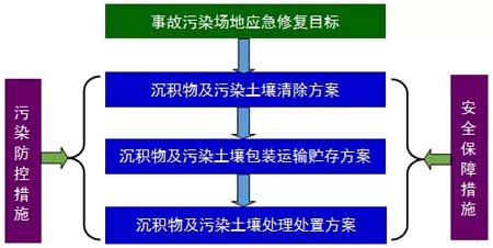 查明場(chǎng)地信息,確定修復(fù)目標(biāo)后,即可制定場(chǎng)地應(yīng)急修復(fù)技術(shù)方案,包括沉積物及污染土壤清除、包裝運(yùn)輸、處理處置方案。由于屬于重大事故條件下應(yīng)急修復(fù),修復(fù)過程中必須嚴(yán)格避免安全事故和二次污染的發(fā)生,因此需要提出可行、可靠的全過程安全保障和污染防控措施。技術(shù)方案制定框架如圖2所示。