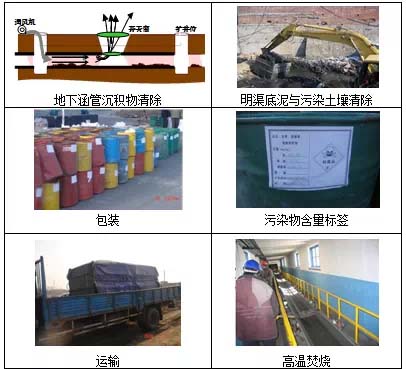 污染場(chǎng)地應(yīng)急修復(fù)對(duì)象主要包括爆炸現(xiàn)場(chǎng)、排水明渠、地下排水涵管,需要處理的廢物包括污染土壤、明渠底泥、涵管沉積物、非水相液態(tài)污染物(NAPL)及積存受污染水。考慮到受污染含水層及地下水修復(fù)周期較長(zhǎng),無法在短時(shí)間內(nèi)實(shí)施完畢,因而未包含在應(yīng)急修復(fù)對(duì)象之中,僅要求查明污染狀況,提出修復(fù)方案,然后開展常規(guī)修復(fù)??梢钥闯觯鹿饰廴緢?chǎng)地應(yīng)急修復(fù)對(duì)象的多樣性和復(fù)雜性均超出了常規(guī)污染場(chǎng)地修復(fù)。