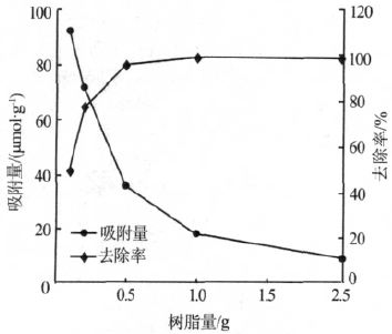 分別稱取預(yù)處理后的濕樹脂0.1、0.2、0.5、1、2 g于錐形瓶中,加入50 mL 廢水(pH=8),25 ℃恒溫?fù)u床振蕩30 min,取樣分析,計(jì)算去除率和吸附量。