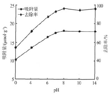 分別取50 mL 廢水,用HCl、NaOH 調(diào)節(jié)pH 為2.0、4.0、6.0、7.0、8.0、10.0、12.0,投加相同量預(yù)處理后的濕樹脂,25 ℃恒溫振蕩30 min(150 r/min),取樣分析,計(jì)算吸附量。