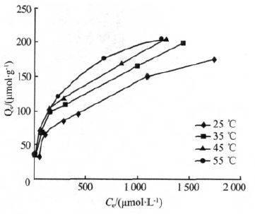 向廢水中投加不同量的Ca2+使其中的鈣離子質(zhì)量濃度分別達(dá)到60、80、100、160、200 mg/L,調(diào)廢水pH=8,添加等量預(yù)處理后的樹脂,分別在25、35、45、55 ℃水浴中恒溫振蕩30 min,取樣分析,計(jì)算吸附量并繪制吸附等溫線。