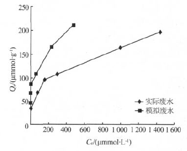 圖 5 C-900 對(duì)實(shí)際廢水和模擬廢水中Ca2+的吸附等溫線