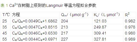 (2)溫度對(duì)Ca2+的平衡吸附量以及樹脂對(duì)Ca2+的選擇性具有重要影響,同等條件下,溫度越高樹脂的平衡吸附量越大,樹脂對(duì)Ca2+的選擇性越強(qiáng)。