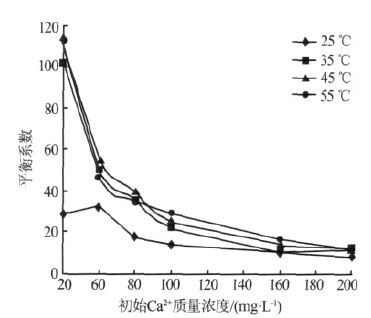 由圖 6 可知,在同一Ca2+初始濃度下隨著溫度升高,平衡系數(shù)增大,特別是25~35 ℃,平衡系數(shù)大幅增加,表明隨著反應(yīng)溫度的增加,螯合樹脂對(duì)Ca2+的選擇性提高,有利于廢水中Ca2+的選擇性去除。