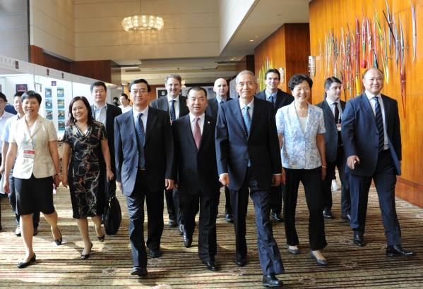 圖為中國(guó)紡織工業(yè)聯(lián)合會(huì)名譽(yù)會(huì)長(zhǎng)許坤元(前右三)、副會(huì)長(zhǎng)徐文英(前右五),中國(guó)毛紡織行業(yè)協(xié)會(huì)會(huì)長(zhǎng)彭燕麗(前右七),中國(guó)國(guó)投國(guó)際貿(mào)易有限公司董事長(zhǎng)張嵩林(前右四),南京羊毛市場(chǎng)名譽(yù)顧問(wèn)??鳎ㄇ坝叶?,中國(guó)國(guó)投國(guó)際貿(mào)易有限公司總經(jīng)理白鴻(前右一),南京羊毛市場(chǎng)董事長(zhǎng)楊梟雄(前右六)及澳大利亞、英國(guó)等外商在親切友好的交談中步入會(huì)場(chǎng)。